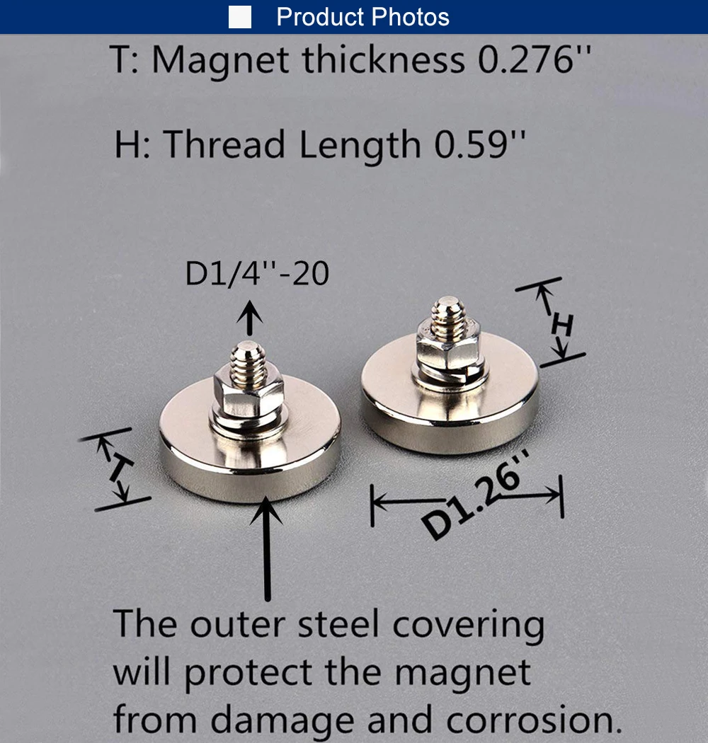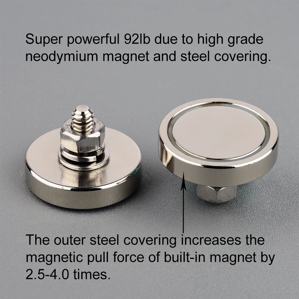 –Made up of N42 neodymium magnet and a steel shell, the steel shell concentrates the magnetic field on the bottom of magnet which increase the magnetic force by 2.5-4 times compared with its naked magnet. The steel cup can alsoprevent the naked magnet to crack and chip.